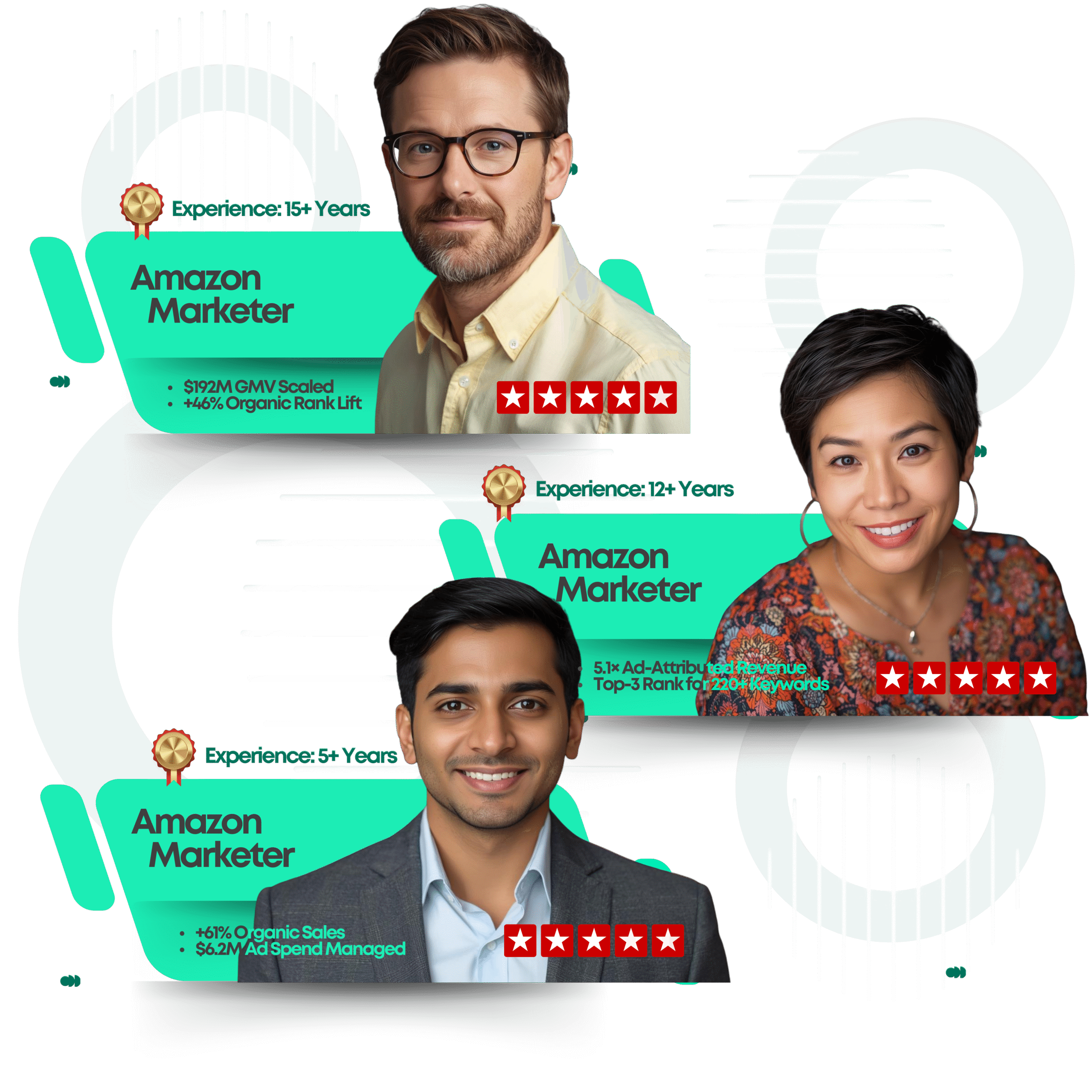 Our top Amazon marketers have experience across Amazon PPC, DSP, SEO, listing optimization, brand registry, and account management, working with fast-growing and enterprise-level brands.