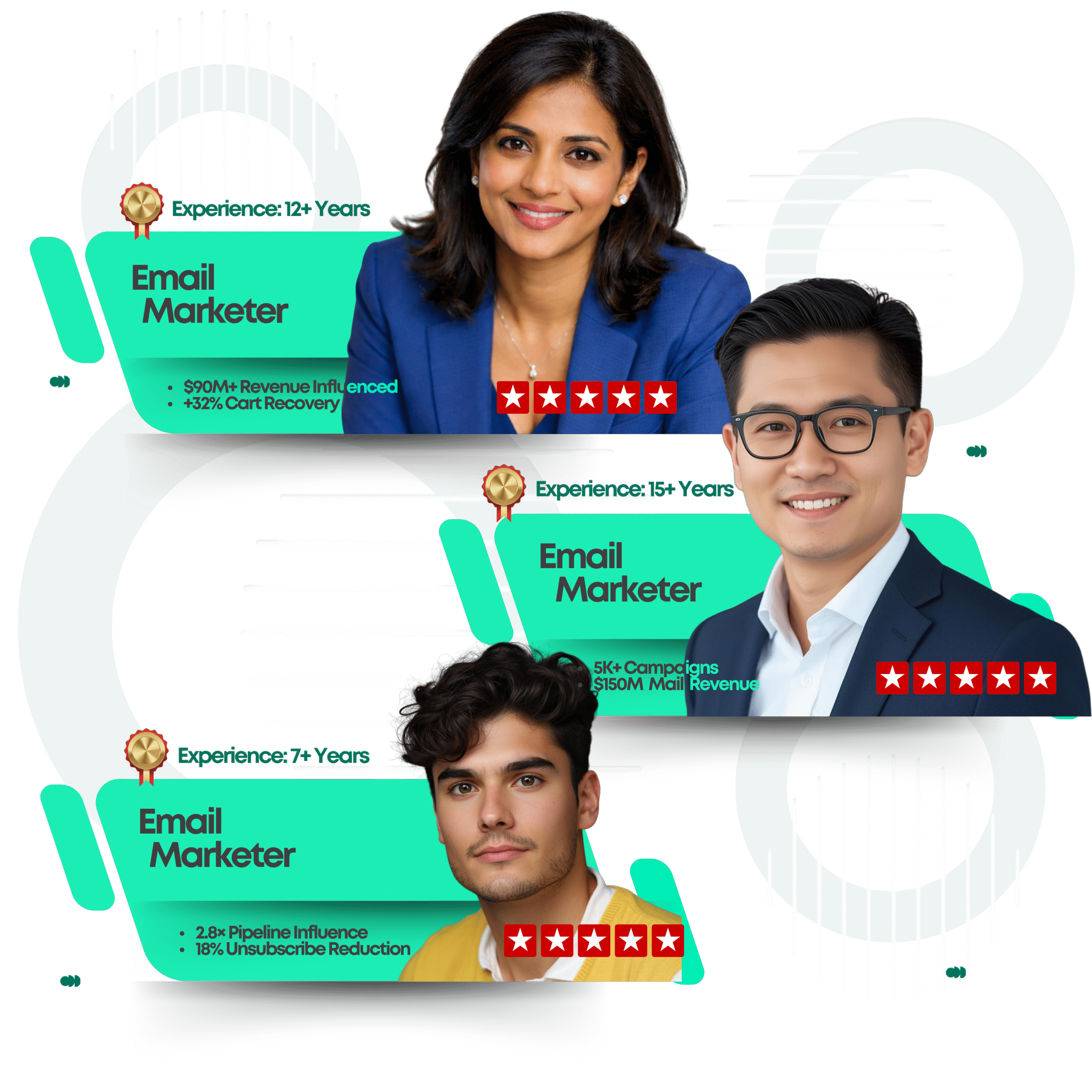 Get elite, battle-tested Email Marketers across the globe, who excel at generating, nurturing, and converting leads through high-performing email campaigns. Rigorously vetted, outcome-driven fractionals and freelancers – available in days, not weeks. Scale lead generation with top-tier email talent you can trust.